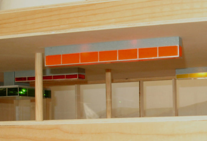 „LICHTBILD“ – Wettbewerb Gymnasium Markt Indersdorf; Konzept für 16 unterschiedlich große, farbige, in langsamem Rhythmus geschaltete lichtplastische Plexiglaskörper über einer Wasserfläche; (Modell)2001/032